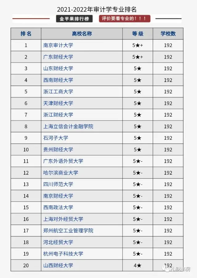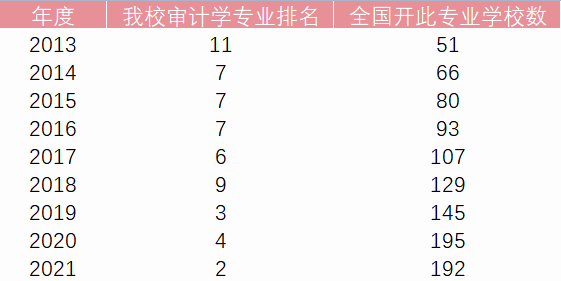 2021年3月,金平果中评榜发布了2021中国大学分专业竞争力排行榜,共计435个榜单,本次分专业排名属于金平果排行榜《中国大学及学科专业评价报告(2021-2022)》的重要组成部分。该评价由杭州电子科技大学中国科教评价研究院和浙江高等教育研究院、武汉大学中国科学评价研究中心和中国科教评价网(www.nseac.com)联合推出,全面、系统、客观、公正地评价了中国大陆2667所大学的实力和水平,并对12个学科门类、92个专业类、435个专业进行了综合竞争力评价。2021版“金平果”大学评价中,大学及学科专业的星级标记体系由5★+、5★、5★-、4★、3★、2★、1★组成,分别对应于大学或学科专业评价排名的前1%、1-5%、5-10%、10-20%、20-50%、50-90%、90-100%的大学或学科专业。其中,m88审计专业荣膺5★+,专业排名高达全国第二。