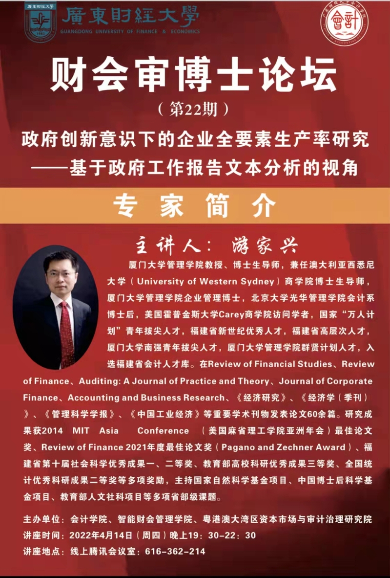 主题:广东财经大学财会审博士论坛(第22期)——政府创新意识下的企业全要素生产率研究——基于政府工作报告文本分析的视角