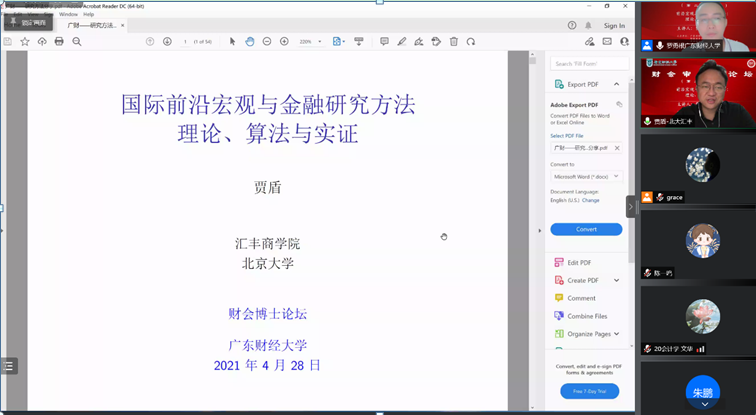 2022年4月28日晚上,m88,m88财会审博士论坛(第23期)在腾讯会议线上举办。本次论坛邀请了北京大学汇丰商学院贾盾助理教授以“前沿宏观与金融研究方法:理论、算法与实证”为主题对m88师生进行分享。论坛由罗勇根老师主持,学院部分教师及研究生共60余人参加。
