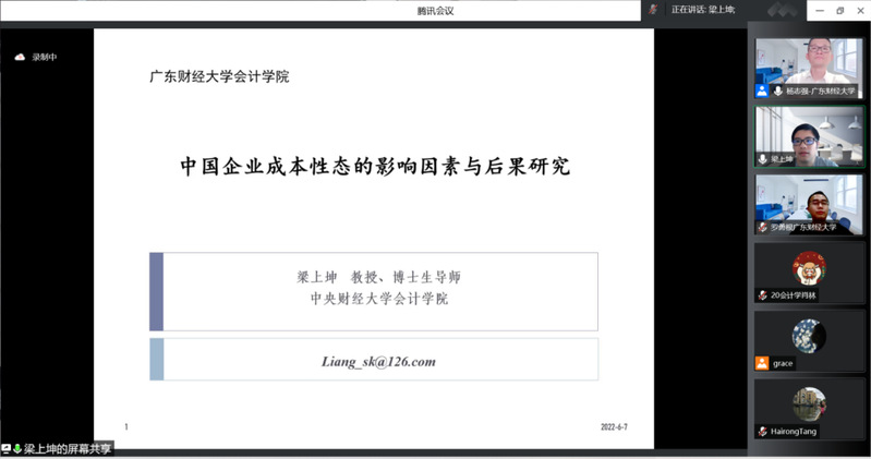 2022年6月7日下午,m88,m88财会审博士论坛(第26期)在腾讯会议线上举办。本次论坛邀请中央财经大学梁上坤教授以“中国企业成本性态的影响因素和后果研究”为主题为m88师生在线进行分享。论坛由m88杨志强教授主持,学院部分教师及研究生共50余人参加。
