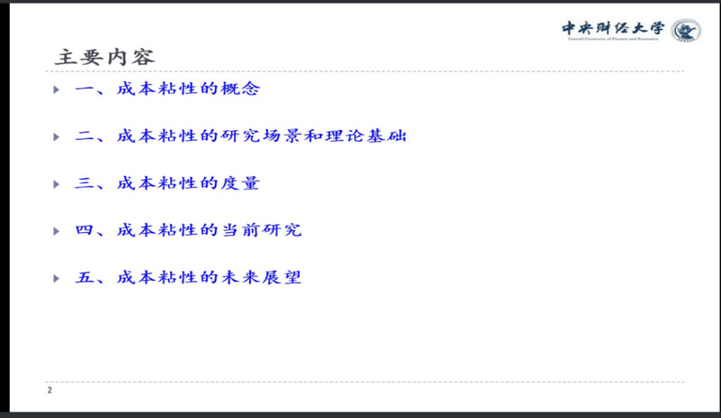 梁上坤教授讲座的主要内容包括成本粘性的概念、成本粘性的研究场景和理论基础、成本粘性的度量、成本粘性的当前研究、成本粘性的未来展望等多个方面。首先,梁上坤教授介绍了研究成本粘性缘起,解释了成本粘性的概念,区分了成本粘性和费用粘性,并且强调概念中常见的理解误区。进一步地,介绍了成本粘性的理论基础,即调整成本动因、管理层乐观预期动因和管理层机会主义动因,提出不能简单将成本粘性定性为好或不好,需要考虑它在不同场景下会有不同的效果。其次,梁教授详细介绍了成本粘性的度量模型以及成本粘性的研究现状,研究现状主要围绕成本粘性的存在性、影响因素探索、经济后果探索和加总经济后果探索四个方面。最后,关于成本粘性未来展望,提出可以尝试跳出Anderson等(2003)的研究框架、研究成本粘性后果或加总成本粘性后果、结合中国独特背景研究以及研究其他支出的粘性等方面。