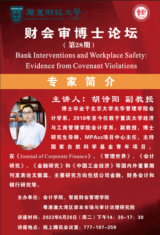 主题:广东财经大学财会审博士论坛(第28期)——Bank Interventions and Workplace Safety: Evidence from Covenant Violations