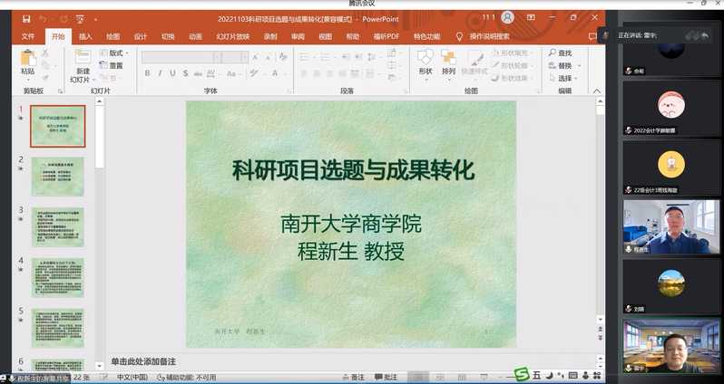 2022年11月8日下午,m88,m88财会审名家论坛(第6期)在线上举办。本次论坛邀请南开大学程新生教授以“科研选题与成果转化”为主题,为m88师生在线进行分享。论坛由m88雷宇院长主持,学院部分教师及研究生共180余人参加。