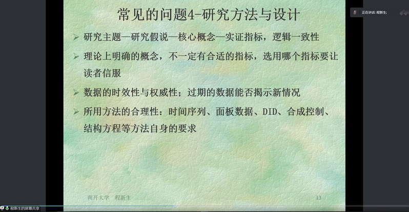 程新生教授本次讲座的主要内容包括科研选题的基本规则、成果转化(论文发表)常见的问题和《南开管理评论》期刊介绍等多个方面。程新生教授首先介绍了科研选题的基本规则,包括选题有新意、叙述有理论、分析有逻辑、方法要规范、论证有证据和结论有价值六个方面。其次,程新生教授分析了成果转化(论文发表)常见的问题。程教授认为主要存在三个方面的问题:一是研究主题失当,缺乏创新性;二是将一个领域的概念平移到另外一个领域而忽略了企业行为与经济后果之间的内在逻辑关系;三是管理现象的实际内涵与所构建的概念相去甚远,研究主题缺乏深入的实践调查研究,研究内容缺乏严谨的逻辑思辨,研究成果的实践价值难以保证。进一步地,程教授从选题、文献评述、研究假设、研究方法和设计、因果关系、阐述过程(表述与证据)六个层面详细分析了论文的写作要点。在选题层面,程教授指出好的选题要有现实意义,要关注本学科领域的经典命题以及新的变化;在文献评述层面,程教授强调要遵循权威性、代表性和时效性原则;在研究假设层面,程教授认为要透过现象看本质,上升到理论的高度,注重分析核心概念之间的内在关系;在研究方法和设计方面,程教授建议多关注数据的时效性和权威性以及所用方法的合理性;在因果关系层面,程教授分析了内生性问题的几个体现以及解决的方法;在阐述过程层面,程教授认为应注重规范性的逻辑关系,这种规范性主要体现在逻辑架构、工具运用和语言表达三个方面。最后,程教授介绍了《南开管理评论》的宗旨、编辑方针以及投稿主题分布等基本内容。