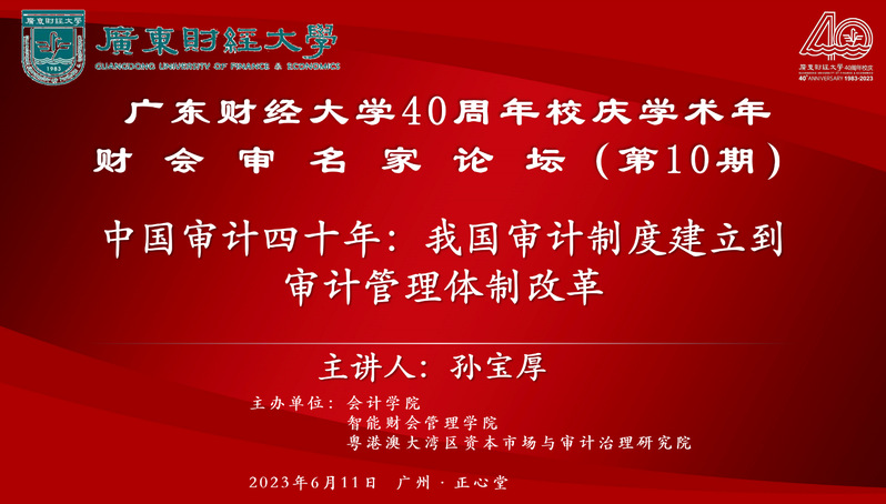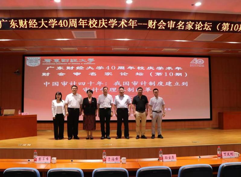 2023年6月11日上午,“广东财经大学40周年校庆学术年——财会审名家论坛(第10期)”在广州校区正心堂举行。中国审计学会会长孙宝厚研究员作题为“中国审计四十年:我国审计制度建立到审计管理体制改革”的报告。校长于海峰、副校长丁友刚出席论坛,论坛由m88院长雷宇主持。m88、智能财会管理学院、审计处等单位领导和师生共180余人参加论坛。