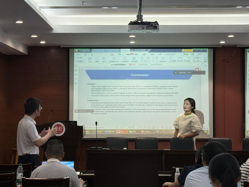 汇报完成后,杨志强老师首先就刘老师论文的逻辑给出了意见,一方面可以从产业链视角去讨论企业绿色创新和并购行为的动机,另一方面也可以细化标的公司,讨论企业是否针对性的开展了绿色并购行为。其次,郑培培老师同样也补充了意见,并且就实证中的工具变量提供了可选方案。最后,王佳卓同学分享了听取刘老师汇报后的想法。他认为刘老师这篇文章角度新颖、实证扎实,为他日后的研究学习提供了新的思路。同时,她也向刘老师分享了自己对完善论文的想法和建议。