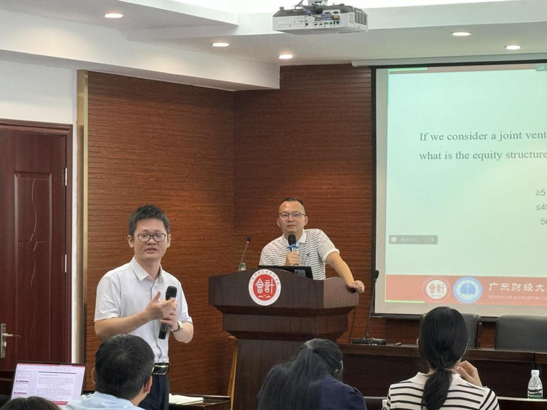 在交流环节,刘骏老师、杨志强老师和尚佳玲同学针对企业文化与企业创新之间的内生性问题、企业文化指标的构建、研究假设的提出和研究贡献等问题与廖友亮老师进行了深入地探讨。