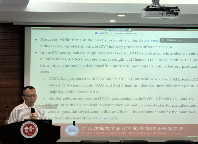 第一个主题是由陈勇老师报告其工作论文《Partnering for Savings: A Game-Theoretic Exploration of Collaborative Strategies for Cost Reduction in Electric Vehicle Battery Supply Chains》。陈老师指出,在降本增效的大背景下,企业在与供应商的合作策略上存在多种选择,有诸多的问题值得探索,如企业降低成本的模式、合作对象、合作意愿等。陈老师以苹果、三星之间的关系为例引出文章的研究主题——合作节约:电动汽车电池供应链中成本降低的博弈论探索。