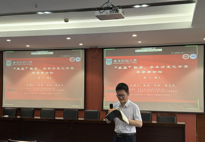 金秋,是思考与成长的季节,亦是学术交流与思想碰撞的好时机。为了进一步强化学术交流平台的建设,促进学术合作与交流,拓宽师生的学术视野,2024年10月18日下午,学院在立德楼(北二)543举办了“求真”教学、学术沙龙之中青年学者论坛(第二期)。本次论坛围绕“创新”“绿色”等重要主题,邀请到学院的三位青年老师陈勇、刘婷和廖友亮分享他们的学术研究成果,吸引了90余名院内外师生参加,老师们匠心引领,学生们收获满满。