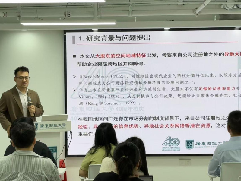 陈老师通过选取2011-2020年中国A股上市公司并购事件为样本,手工收集大股东来源地数据,运用非线性概率Probit模型进行实证分析。最终发现,异地大股东的存在显著提高了企业跨省并购的概率,尤其是当异地大股东具有国有性质、较长经营年限、委派董事或高管兼职等特征时,这种促进效应更为明显。陈老师还通过机制检验进一步分析发现,有来自标的方所在省份的异地大股东的企业,异地并购后的长期绩效表现更好,说明异地大股东促进企业异地并购有利于实现资源整合与配置效率提升。